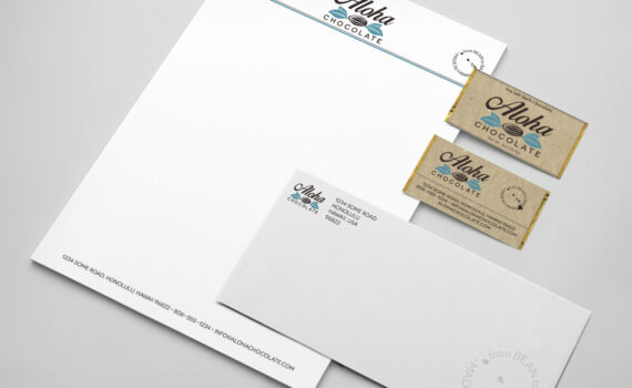 I created a fictitious company named 'Aloha Chocolate' and designed the logo and a number of promotional pieces. Aloha Chocolate